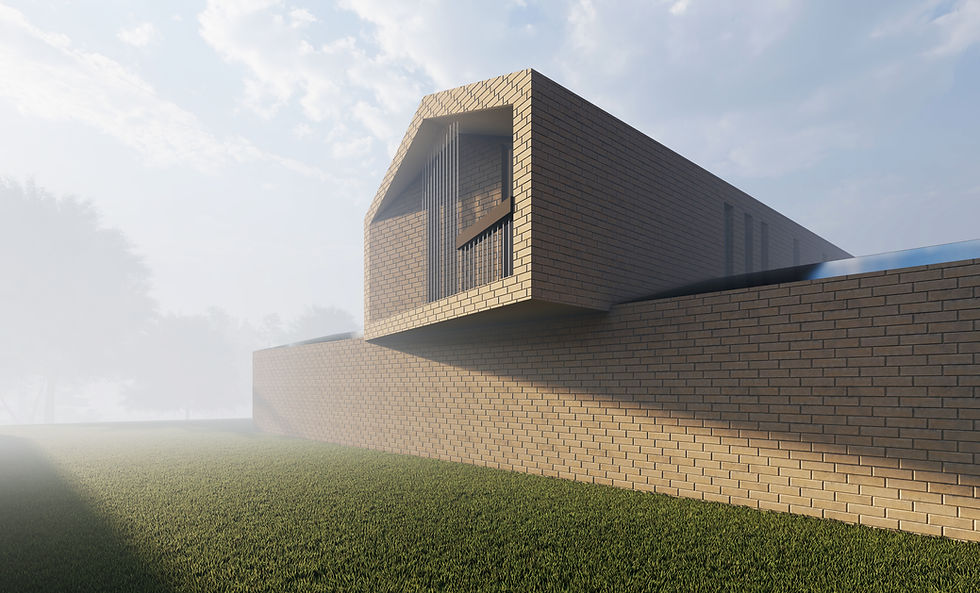 Il volume superiore si distingue per la sua disposizione perpendicolare , in contrasto con le volumetrie sottostanti, si caratterizza per una tessitura materica continua in laterizio a faccia vista, realizzato in mattone marchigiano, materiale identitario che conferisce all’edificio un forte radicamento al luogo.