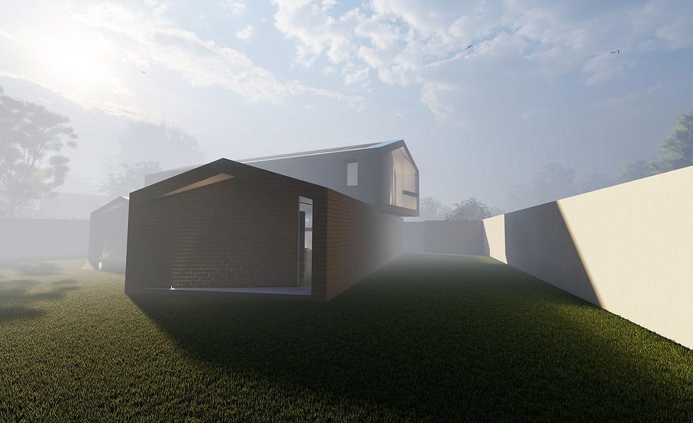 L’articolazione volumetrica si sviluppa attorno ad un patio centrale, vero fulcro compositivo e spaziale, che media il rapporto tra interno ed esterno e ridefinisce la soglia domestica come luogo di relazione e filtro climatico. Il piano terra si frammenta in due corpi di fabbrica a pianta semplice, dalle coperture a falda inclinata, che evocano archetipicamente le stalle e i volumi rurali della campagna marchigiana, riproposti però con un linguaggio minimale e asciutto. Questi volumi accolgono le funzioni diurne e di servizio, scanditi da pieni e vuoti che creano porticati e spazi semiaperti, enfatizzando la permeabilità visiva verso il giardino.